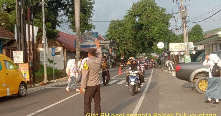 Cirebon - Salah satu bentuk Pelayanan Polri kepada masyarakat, Polsek Dukupuntang Polresta Cirebon melaksanakan giat rutin pengaturan lalu lintas di pagi hari, Selasa Pagi (25/11/2025). Giat pengaturan lalin tersebut dilaksanakan didepan SMK Mambaul Ulum termasuk Jl. Nyi Ageng Serang Desa Sindangmekar Kecamatan Dukupuntang Kabupaten Cirebon, untuk mengatur kelancaran arus lalin pada jam sibuk aktivitas masyarakat di pagi hari, dan jam masuk sekolah. Giat pengaturan arus lalin tersebut rutin dilaksanakan setiap pagi oleh Personil Polsek Dukupuntang bergantian sesuai jadwal. Kapolsek Dukupuntang AKP Nuryana menyampaikan bahwa, Pelayanan kepada masyarakat, berupa pengaturan lalu lintas merupakan salah satu tugas Kepolisian, karena dengan hadirnya Anggota Kepolisian melaksanakan pengaturan lalu lintas diharapkan dapat menekan angka kecelakaan lalu lintas dan terciptanya tertib berlalu lintas di wilayah Polsek Dukupuntang serta memberikan rasa aman dan nyaman bagi masyarakat.