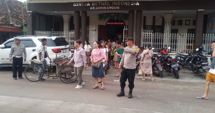 Cirebon - Anggota Polsek Arjawinangun hadir di pagi hari untuk melaksanakan pengamanan Kebaktian yang bertempat di gereja GBI Arjawinangun yang menjadi lokasi ibadah umat Kristiani, di wilayah hukum Polsek Arjawinangun. Minggu, 14/12/2025