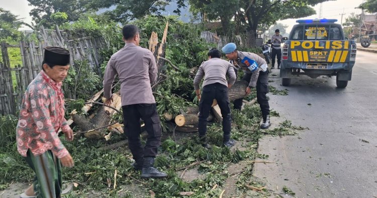 Personil Patroli Polsek Gebang di bantu oleh warga sekitar mengevakuasi pohon tumbang yang menghalangi jalan raya Pantura tersebut