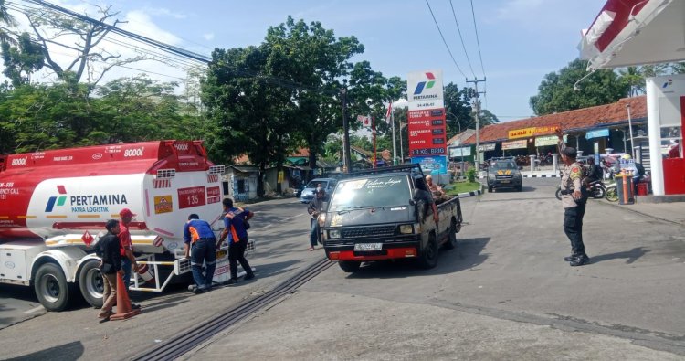 Dukupuntang - Minggu (28/12/2025) Personil Pos Pam Dukupuntang merespon cepat laporan warga tentang kendaraan pengangkut BBM yang mengalami trouble di jalan depan SPBU Dukupuntang.
